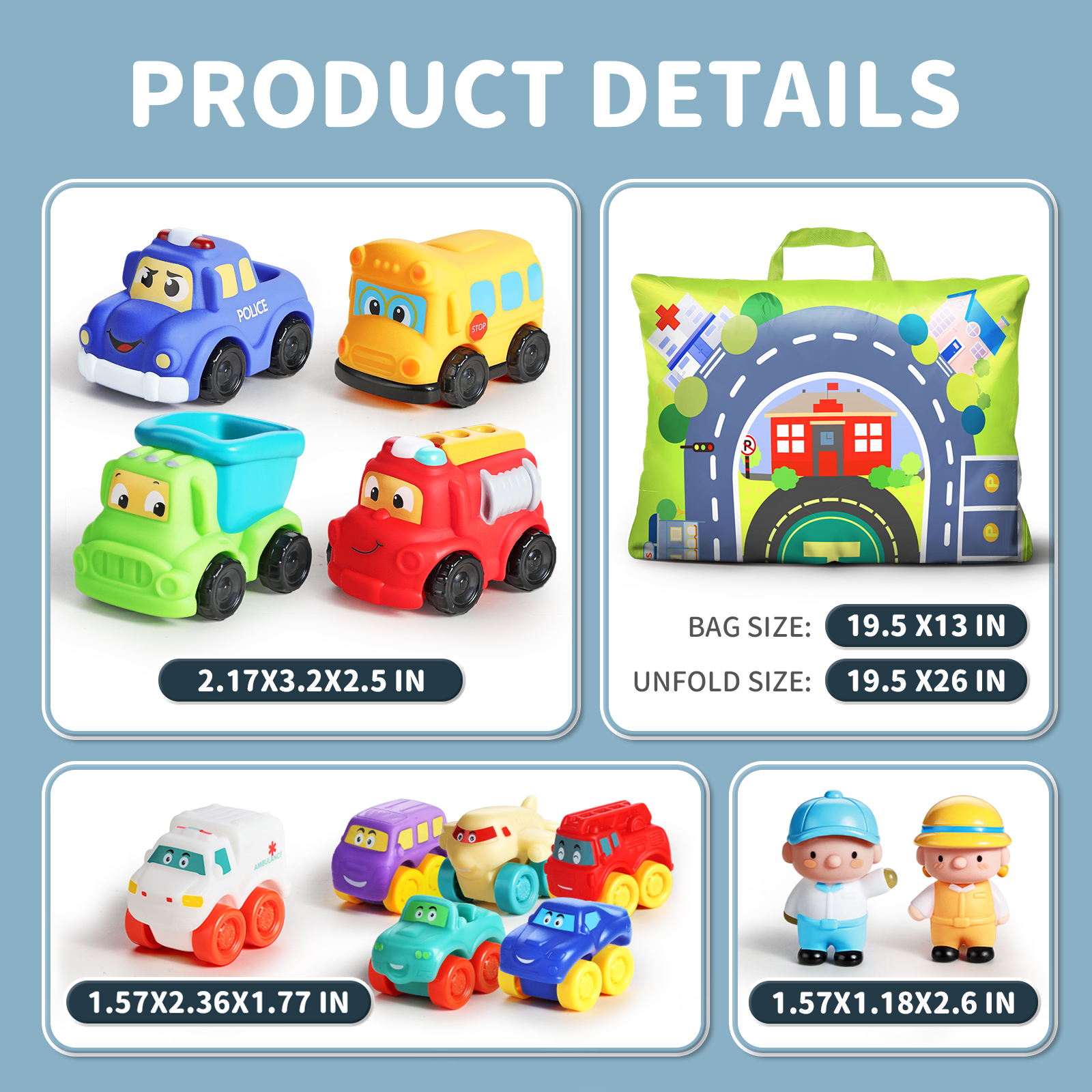 - Explore & Imagine:This car toy set includes 10 rubber cars like a police car, fire truck, ambulance,and 2 cute figures.It can bring the city to life