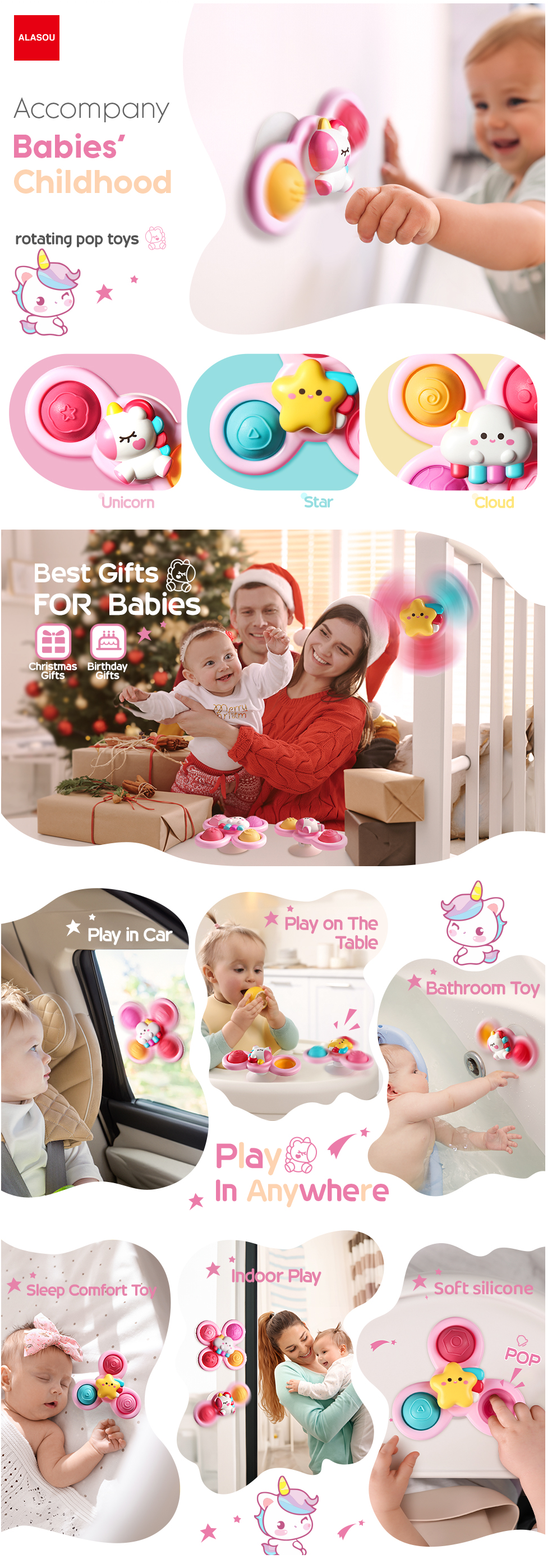 ALASOU 3PCS Pop Suction Cup Spinner Toys for 1 Year Old Boy Girl|Novelty Spinning Tops Toddler Toys Age 1-2|Sensory Baby Bath Toys for Toddlers 1-3|12 18 Months Boy Birthday Gift for Infant