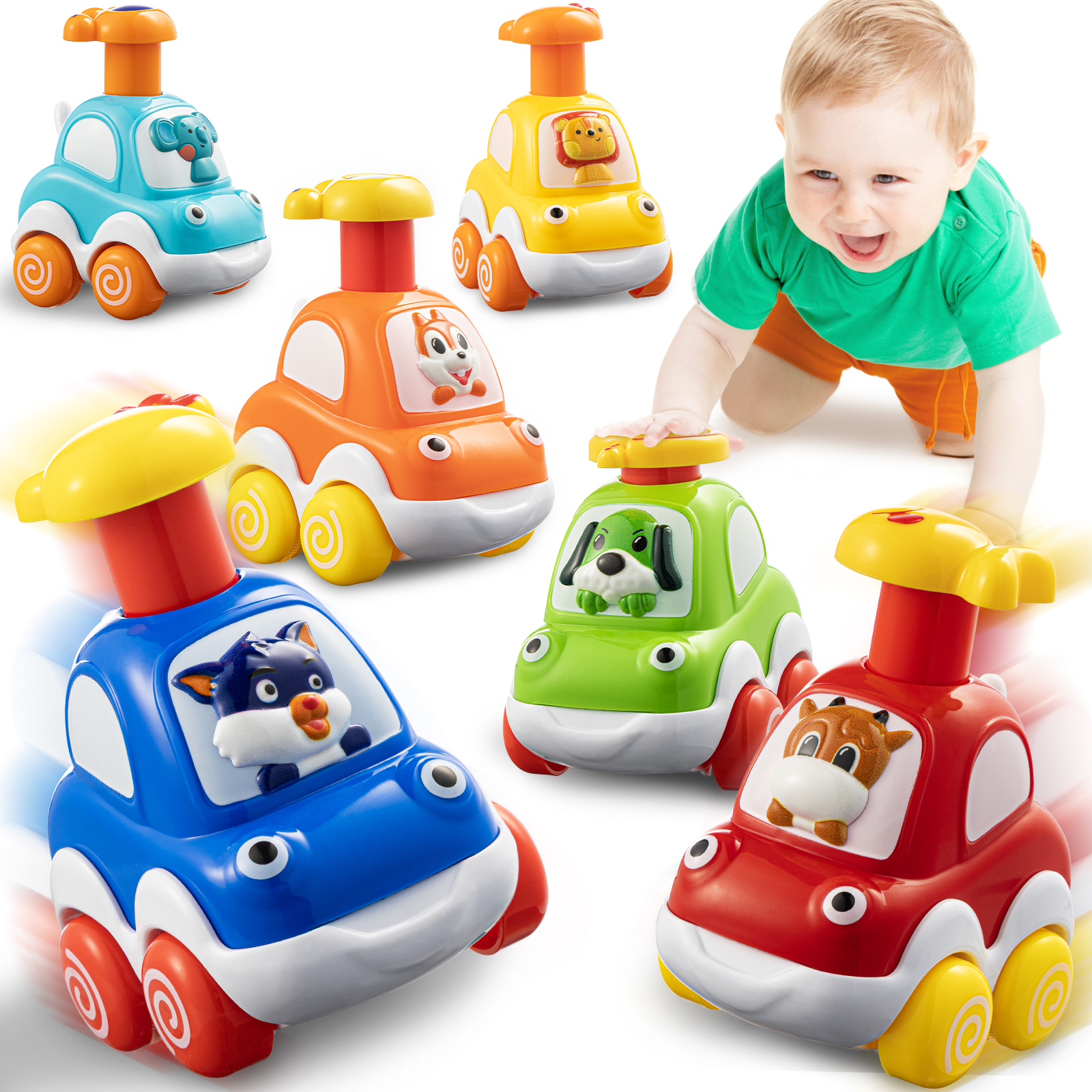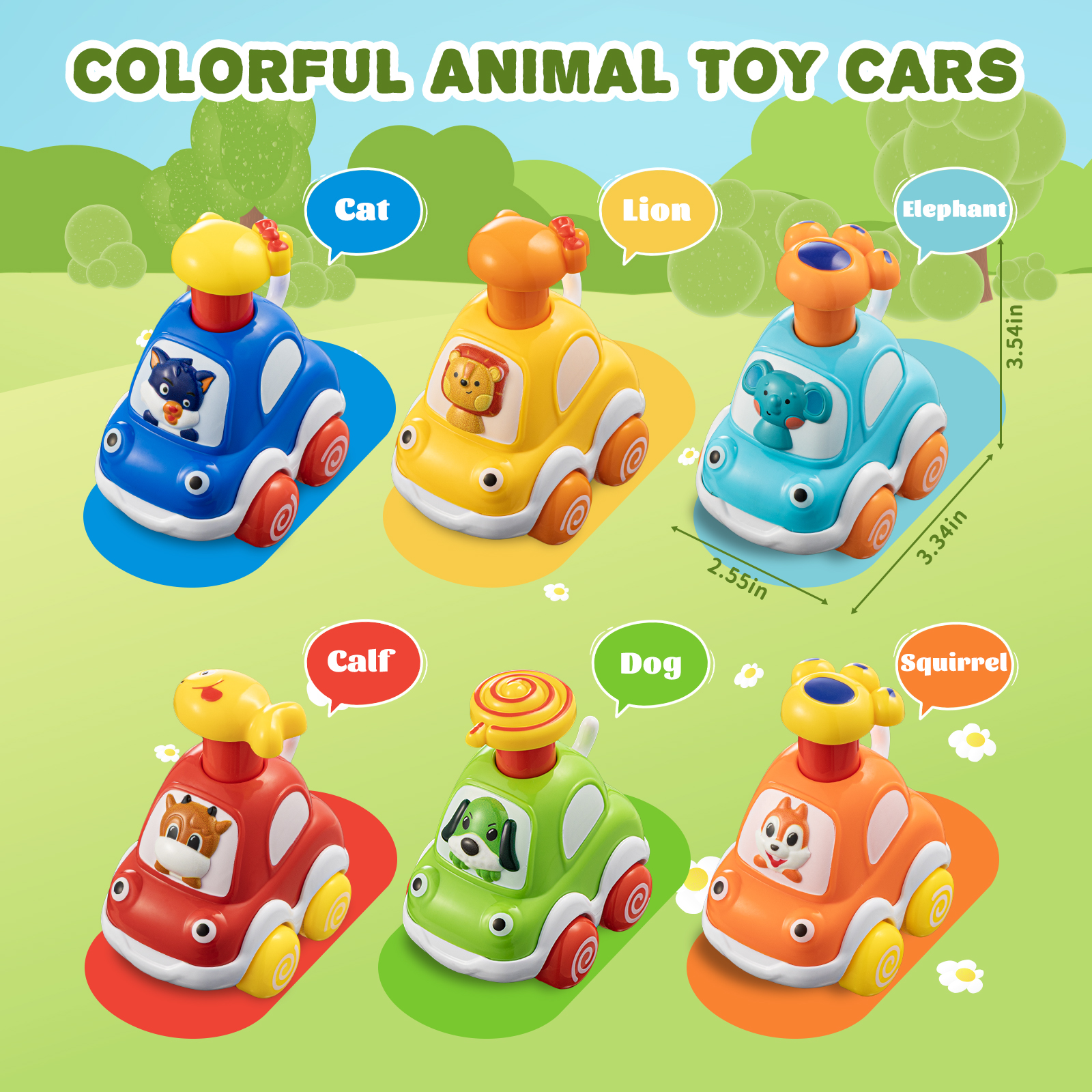 • Colorful Cartoon Toy Cars: 6 Cute animals: calf, dog, squirrel, cat, lion, elephant. Bright colors and amazing design
