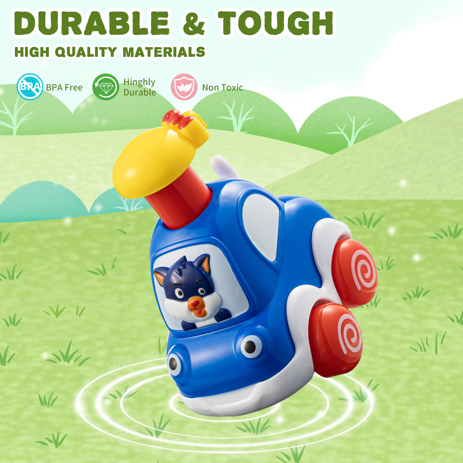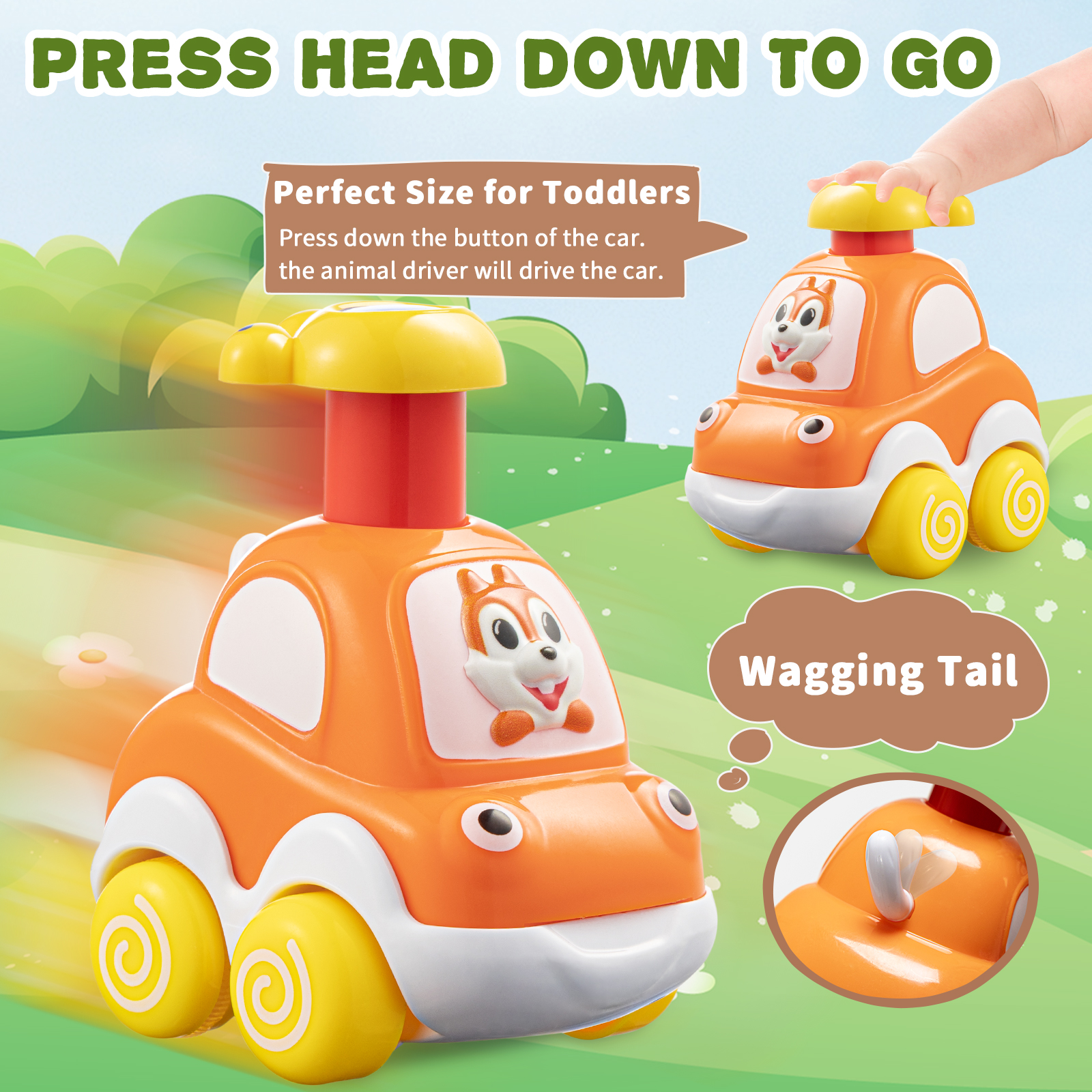 • Press and Go Cars:No batteries required. Just press the knob and let it run!The tail wagging while the car’s running, easy to play, great for kids ages 2 and up
