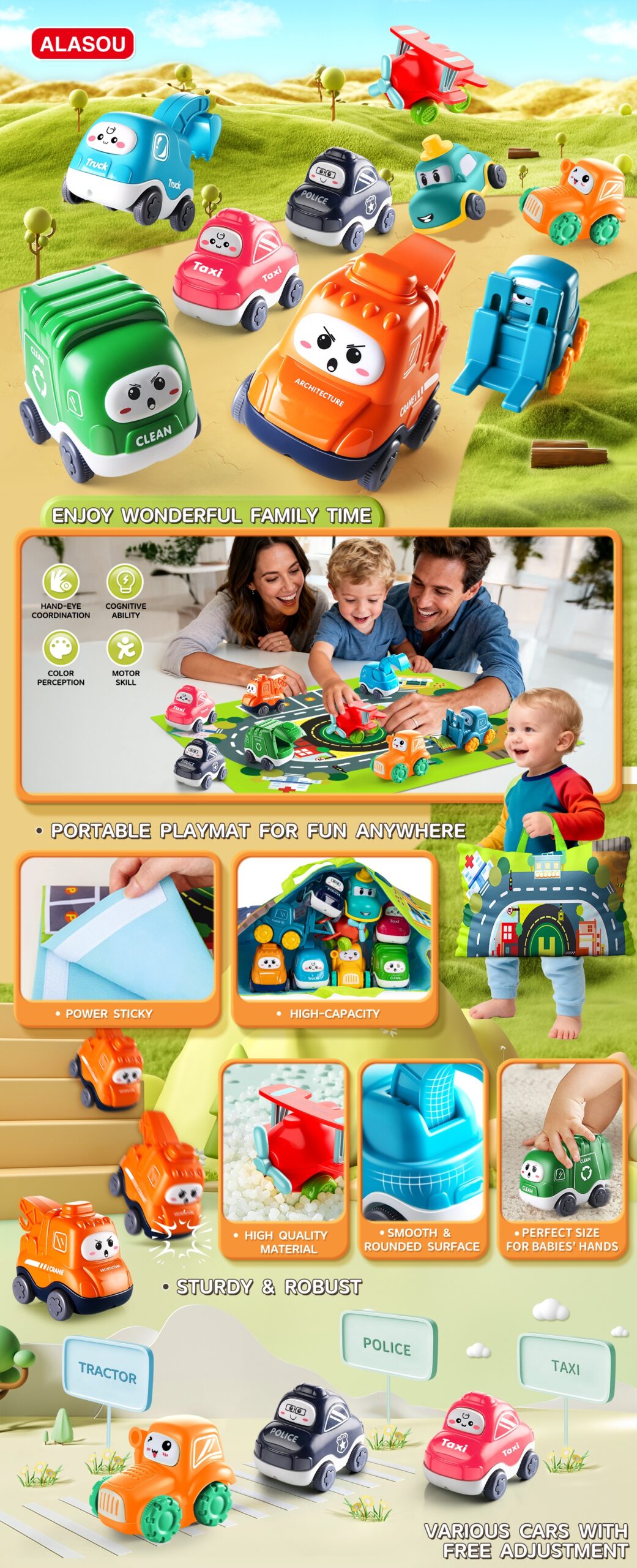 • Ability Improving:Through learning how to push and pull small cars,kids develop imaginations, cognitive and motor skills