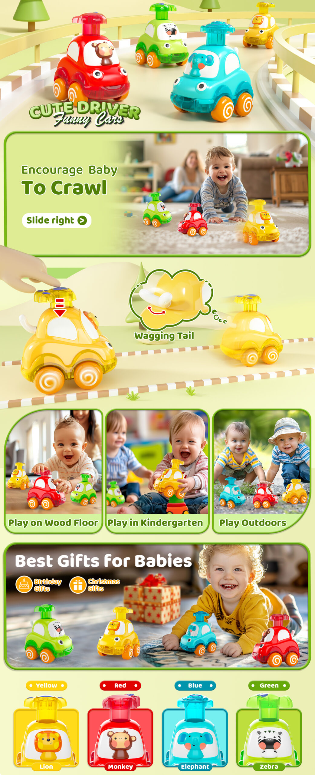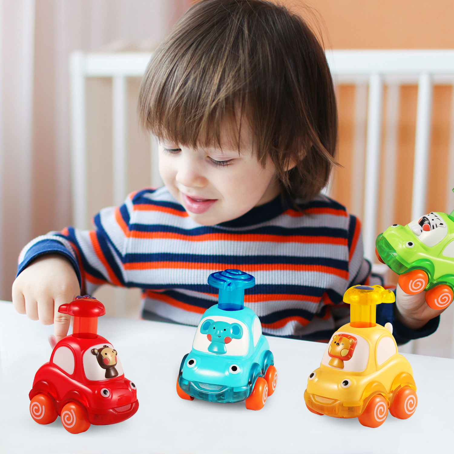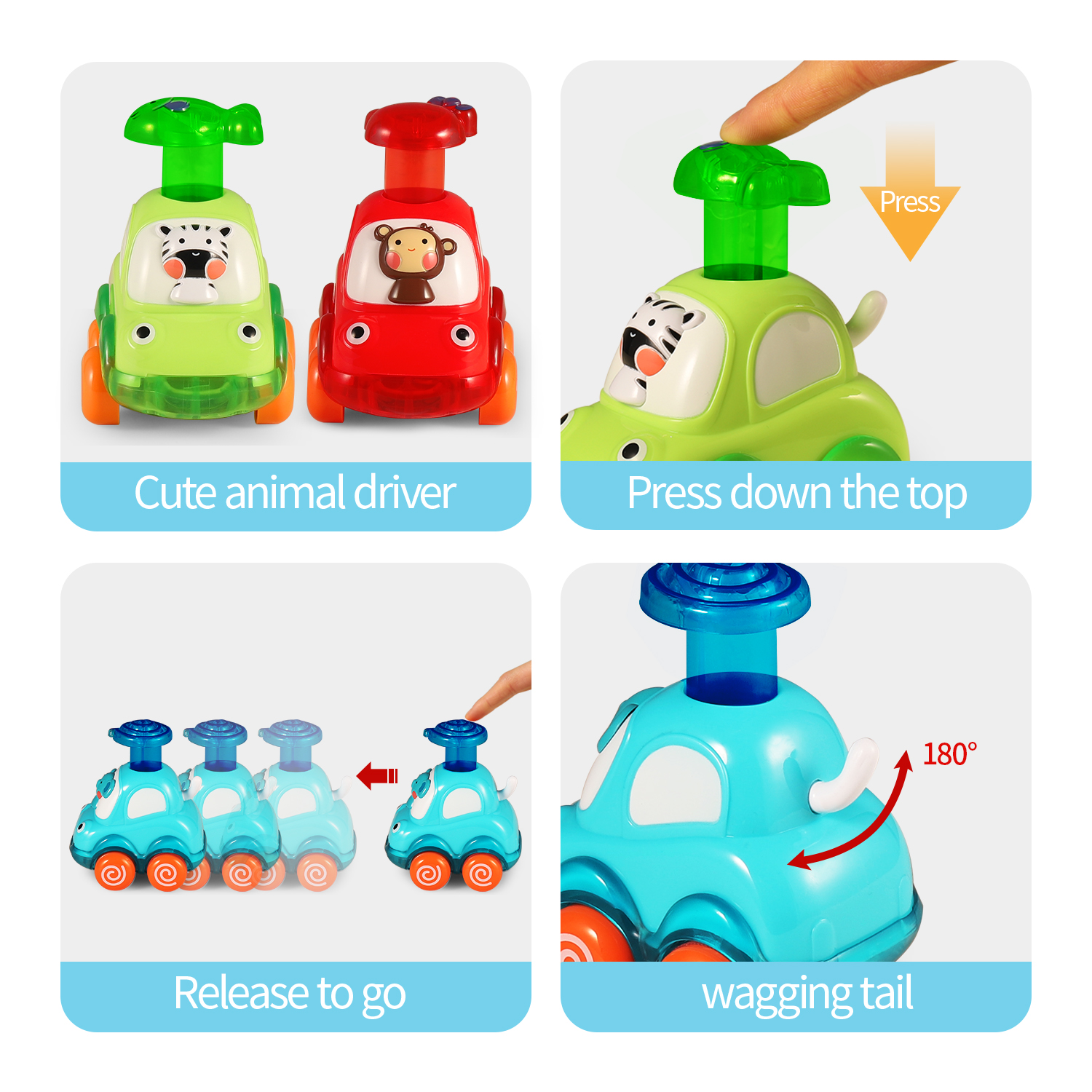 - Colorful Cartoon Toy Cars: 4 Cute animals: monkey, lion, zebra,elephant. Bright colors and amazing design