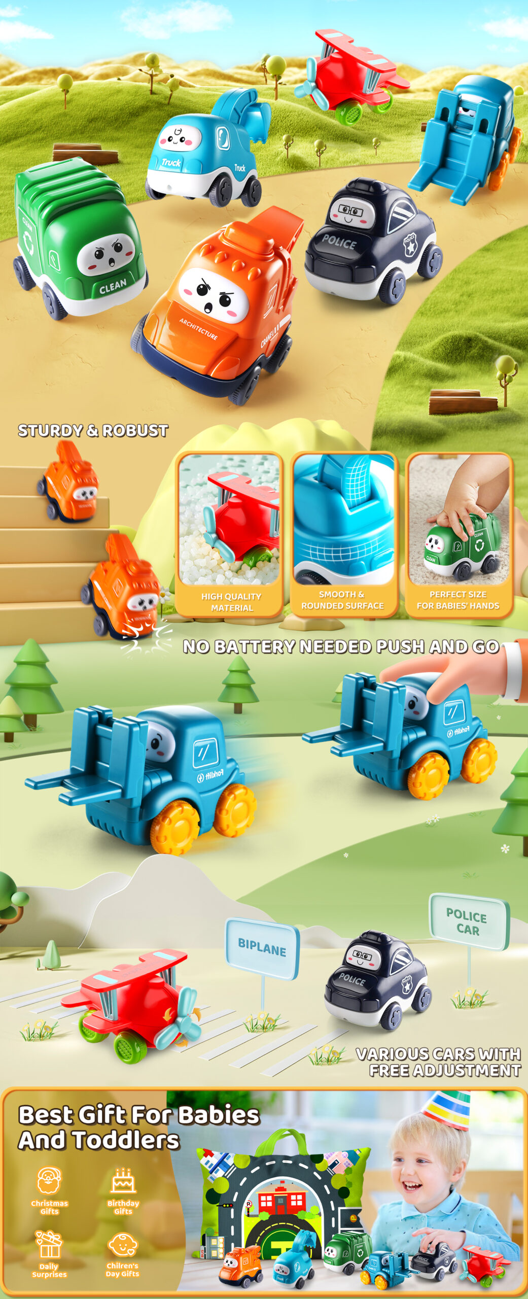 - Ability Improving:Through learning how to push and pull small cars,kids develop imaginations, cognitive and motor skills