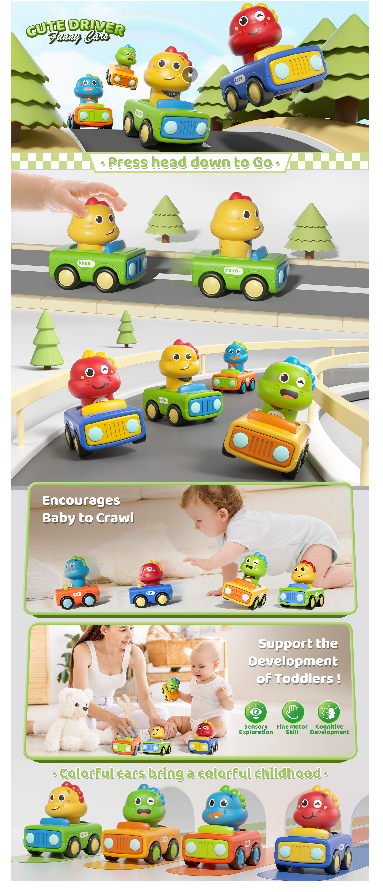 - Colorful Dinosaur Toy Cars:Bright colors and cute design.The toy cars set will attract kids and help stimulate kids’ imagination, improve color recognition and practical ability