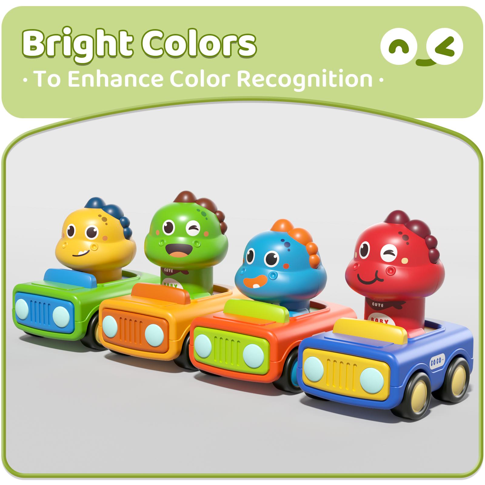 - Colorful Dinosaur Toy Cars:Bright colors and cute design.The toy cars set will attract kids and help stimulate kids’ imagination, improve color recognition and practical ability